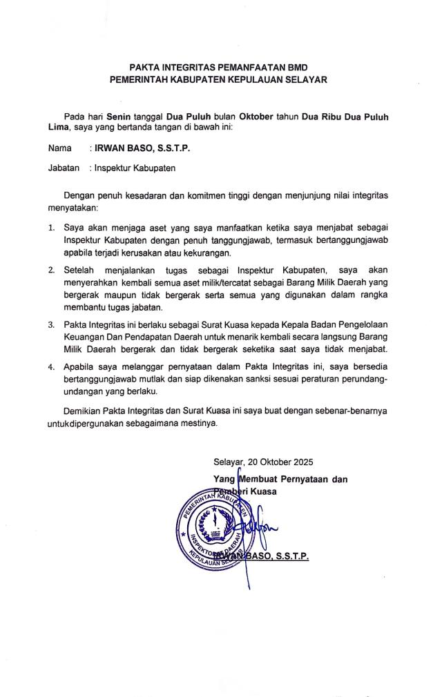 PAKTA INTEGRITAS PEMANFAATAN BMD PEMERINTAH KABUPATEN KEPULAUAN SELAYAR
